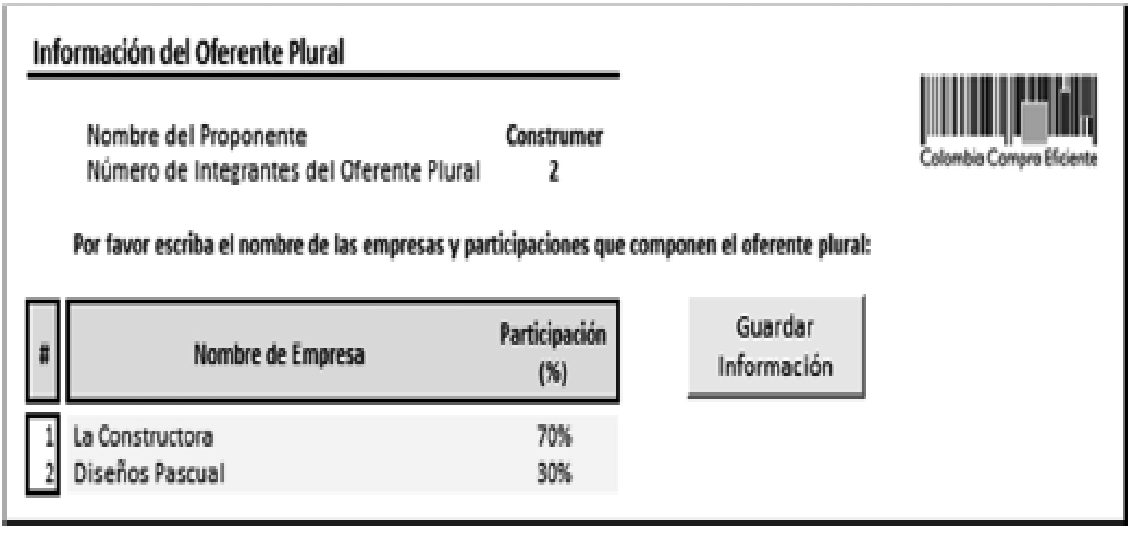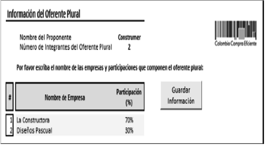 Posteriormente, el proponente debe indicar la participación de cada uno de los integrantes del oferente plural.