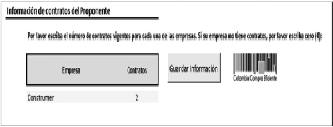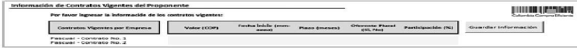 Posteriormente, el proponente debe registrar la información de cada uno de los contratos registrados en el anterior formulario: