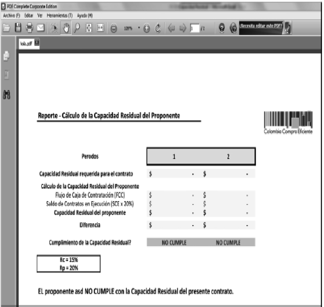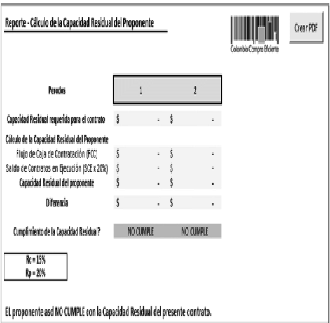 El botón “Calcular” realizará todos los cálculos establecidos en la metodología descrita en el presente manual y creará un reporte en donde definirá si el proponente cumple con la Capacidad Residual Exigida para el presente contrato: