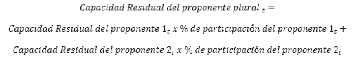 La Capacidad Residual del oferente plural es el promedio ponderado de la Capacidad Residual de los integrantes del proponente plural, en donde el ponderador corresponde al porcentaje de participación en el oferente plural.