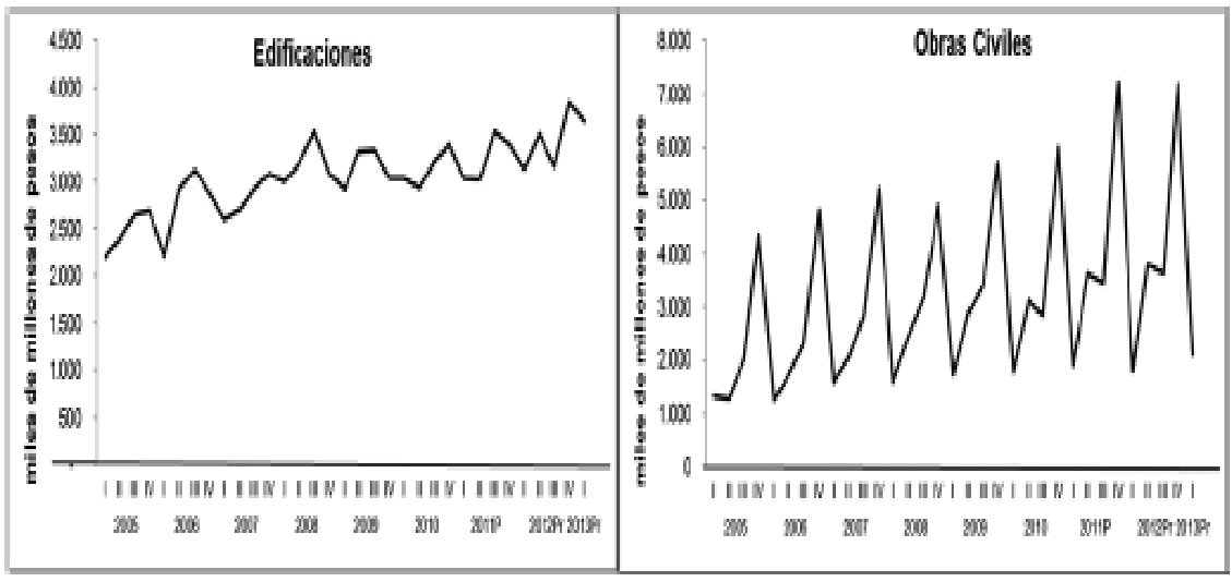Las gráficas siguientes muestran el comportamiento de los indicadores de Edificaciones y de Obras Civiles para cada trimestre, desde el año 2000 hasta el primer trimestre de 2013. En ellas se observa una estacionalidad muy marcada y una leve tendencia del indicador.