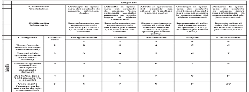 | Calificación Cualitativa | Obstruye la ejecución del contrato de manera intrascendente. | Dificulta la ejecución del contrato de manera baja, aplicando medidas mínimas se puede lograr el objeto contractual | Afecta la ejecución del contrato sin alterar el beneficio para las partes | Obstruye la ejecución del contrato sustancialmente pero aun así permite la consecución del objeto contractual | Perturba la ejecución del contrato de manera grave imposibilitando la consecución del objeto contractual. | |