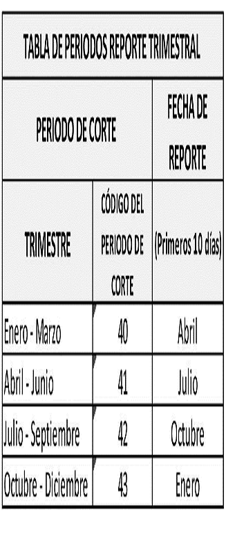 -- Archivo tipo 543: trimestralmente, dentro de los primeros diez (10) días calendario del mes posterior a la finalización del periodo a reportar, si la fecha de reporte es un día no hábil (sábado, domingo o festivo), este se realizará al siguiente día hábil de la fecha de corte (Ver Tabla Periodos de Reporte Trimestral).