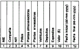 Para cada planta lmacenadota y envasadora relacionada en el formato C.1. se debe cargar el siguiente formato, el cual consiste en un archivo plano tipo csv, que cumple con las especificaciones establecidas en el Anexo A y que contiene las siguientes columnas y en el orden expuesto a continuación: