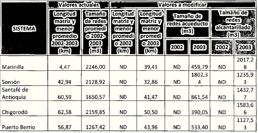 En este sentido, vale la pena mencionar que los valores contenidos en la Resolución CRA 346 de 2005 corresponden a promedios de los años 2002 y 2003, razón por la cual para el nuevo cálculo se requiere tener información para estos dos años. Sin embargo, una vez revisados los archivos allegados a esta Comisión se evidencia que la información enviada corresponde únicamente al año 2003, situación que fue comunicada telefónicamente sin obtener respuesta alguna al respecto. A continuación se presenta el cálculo hecho por esta Comisión en relación con las variables longitud de red y tamaño de red para el año 2003, teniendo en cuenta la información enviada por el prestador: