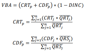 En relación con el segundo aspecto, la metodología tarifaria establece que el valor base de remuneración de aprovechamiento -VBA resulta de la suma de los costos ponderados de las actividades de Recolección y Transporte y Disposición final cobradas en el municipio, valor que viene afectado por el DINC para los suscriptores que conforman macrorrutas que presentan valores de rechazo menores al 20%(13). El valor resultante de la siguiente fórmula se multiplica por la cantidad de toneladas de residuos efectivamente aprovechados que cada persona prestadora de aprovechamiento del municipio reporta ante el Sistema Único de Información - SUI.