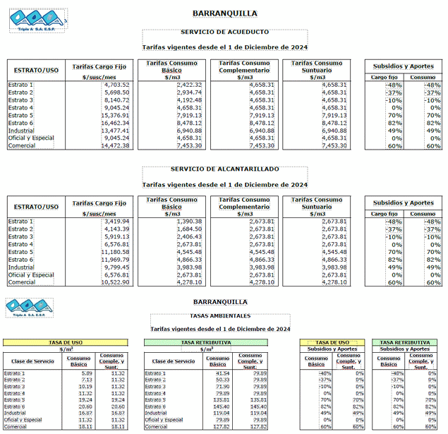 Para atender su tercera inquietud a continuación se presenta el cuadro de tarifas aplicadas a partir del mes de diciembre de 2024, que el prestador Triple A S.A. E.S.P., publica en su página web www.aaa.com.co para el distrito de Barranquilla.