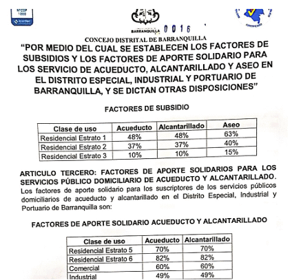 Los demás valores que se muestran en el cuadro citado, corresponden al valor del costo económico de referencia citado en el párrafo anterior descontando el porcentaje de subsidios o incrementando el porcentaje de contribución que estableció el Concejo Distrital de Barranquilla mediante Acuerdo 016 de 2020, como se muestra en la siguiente imagen: