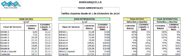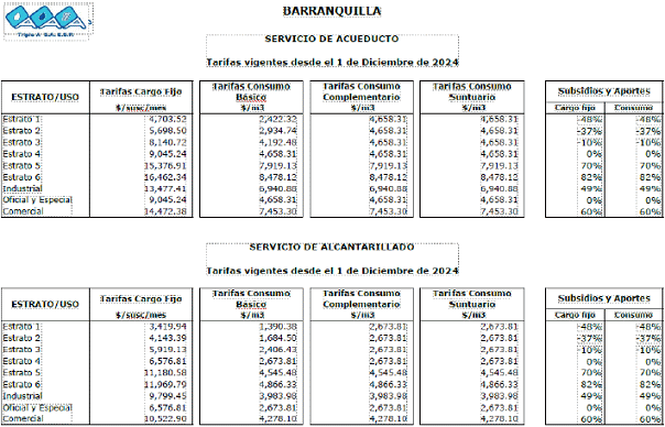 Para mayor claridad de lo anterior, a continuación se presenta el cuadro de tarifas aplicadas a partir del mes de diciembre de 2024, que el prestador Triple A S.A. E.S.P., publica en su página web www.aaa.com.co para el distrito de Barranquilla.