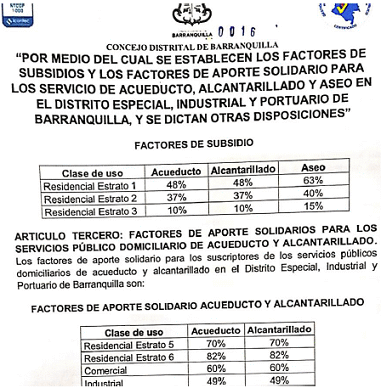 Los demás valores que se muestran en el cuadro citado, corresponden al valor del costo económico de referencia citado en el párrafo anterior descontando el porcentaje de subsidios o incrementando el porcentaje de contribución que estableció el Concejo Distrital de Barranquilla mediante Acuedrdo 016 de 2020, como se muestra en la siguiente imagen: