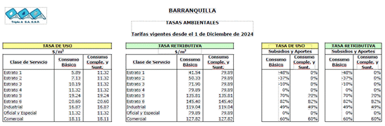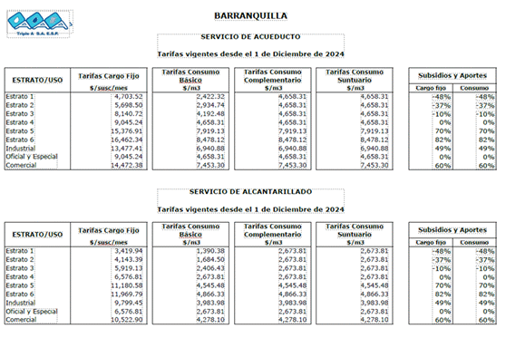 Para mayor claridad de lo anterior, a continuación se presenta el cuadro de tarifas aplicadas a partir del mes de diciembre de 2024, que el prestador Triple A S.A. E.S.P., publica en su página web www.aaa.com.co para el distrito de Barranquilla.