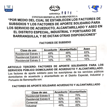 Los demás valores que se muestran en el cuadro citado, corresponden al valor del costo económico de referencia citado en el párrafo anterior descontando el porcentaje de subsidios o incrementando el porcentaje de contribución que estableció el Concejo Distrital de Barranquilla mediante Acuedrdo 016 de 2020, como se muestra en la siguiente imagen: