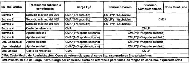 Particularmente en los servicios públicos domiciliarios de acueducto y alcantarillado, en los usuarios de los estratos 1, 2 y 3, se subsidia únicamente hasta el monto de los porcentajes establecidos en la ley, el cargo fijo y el cargo por consumo básico hasta un rango de 20 m3 si la facturación es mensual ó 40 m3 si la facturación es bimestral, aplicando tarifariamente para los consumos superiores a este volumen (consumos complementario y suntuario) el costo de referencia calculado. Así mismo se aclara que no existen diferencias tarifarias entre los consumos complementario y suntuario.