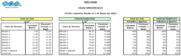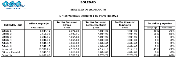 Para aclarar lo anterior, a continuación, se presenta el cuadro de tarifas aplicadas en el mes de mayo de 2025, que el prestador Triple A S.A. E.S.P., publica en su página web www.aaa.com.co para el municipio de Soledad en el departamento del Atlántico.