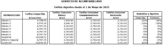 Para el servicio de alcantarillado, el valor de los Costos Económicos de Referencia corresponden a de $6.797,79 en el cargo fijo, $2.763.65 en el cargo por consumo y $79,89 en tasas ambientales.