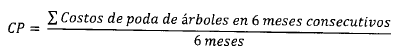 Con respecto al costo de la actividad de poda, el artículo 16 de la Resolución CRA 720 de 2015 establece la siguiente ecuación para el cálculo del costo máximo de poda de árboles, la cual debe ser aplicada por cada prestador y cuyo resultado corresponde al precio techo de la actividad para el Área de Prestación del Servicio - APS que atienda, así: