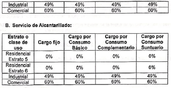 Para el servicio de alcantarillado, el valor de los Costos Económicos de Referencia corresponden a de $6.797,79 en el cargo fijo, $2.763.65 en el cargo por consumo y $79,89 en tasas ambientales.