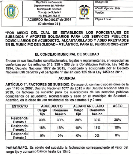 Ahora bien, para establecer el valor a cobrar a los usuarios de cada uno de los estratos y usos en el municipio de Soledad sobre el valor de los Costos Económicos de Referencia se aplican los porcentajes de subsidios y contribuciones que determinó el Concejo Municipal de Soledad mediante el Acuerdo No. 000327 de 2024, que se muestra en la siguiente imagen:
