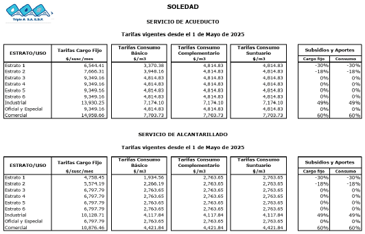 Hecha esta precisión, para entender cómo funciona la aplicación de los factores de subsidios y contribuciones sobre los costos económicos de referencia, a continuación se presenta una descripción de que es lo que se observa en el cuadro de tarifas aplicadas en el mes de mayo de 2025, que el prestador Triple A S.A. E.S.P., publica en su página web www.aaa.com.co para el municipio de Soledad en el departamento del Atlántico.