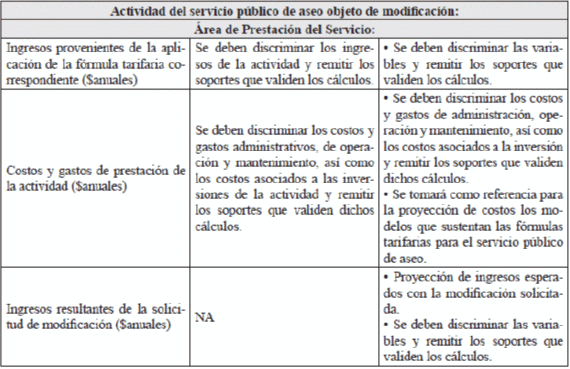 Conforme con el artículo 5.2.3.1. de la Resolución 864 de 2018[8] 8 relacionado con el contenido de la solicitud para la modificación de la fórmula tarifaria del servicio público de aseo, según el artículo 16 del Código de Procedimiento Administrativo y de lo Contencioso Administrativo, o la norma que lo modifique, adicione o sustituya, las solicitudes de modificación de la fórmula tarifaria del servicio público de aseo para cada área de prestación del servicio, deberán cumplir con los siguientes requisitos generales:
