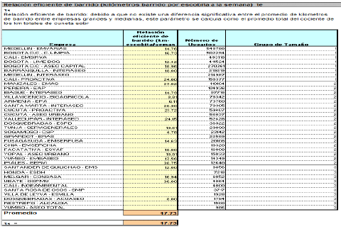 Ahora bien, en el anexo “Modelo barrido y limpieza DEFINITIVO.xls” en la hoja “Barrido y Limpieza” en el rango de celdas A360:F408 se denota los registros que se tuvieron en cuenta para el cálculo del parámetro Relación eficiente de barrido (kilómetros barridos por escobita a la semana Te) = 17.73 kilómetros / escobita - semana, producto del promedio simple de 24 observaciones de las 37 empresas incluidas en el análisis realizado en este documento, como se muestra a continuación: Ilustración 1. Extracto anexo “Modelo barrido y limpieza DEFINITIVO.xls”, relación eficiente de barrido y limpieza.