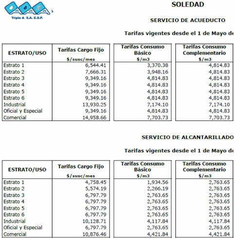 Cabe resaltar que lo anterior corresponde a una interpretación de las tablas de tarifas aplicadas publicadas por el prestador Triple A S.A. E.S.P., pero no constituye en un pronunciamiento sobre la correcta aplicación del régimen tarifario cuya competencia radica en cabeza de la Superintendencia de Servicios Públicos Domiciliarios - SSPD.