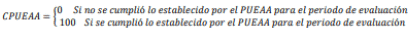 | EVALUACIÓN FÓRMULA | Para el cálculo del indicador se aplicará la siguiente fórmula: En concordancia con lo establecido por el artículo 3 de la Ley 373 de 1997, las Autoridades Ambientales serán las encargadas de realizar el respectivo seguimiento y control al cumplimiento del PUEAA. En este sentido, el cumplimiento del PUEAA serátado por la autoridad ambiental a la Superintendencia de Servicios Públicos Domiciliarios - SSPD para realizar el cálculo del indicador. En caso que la Autoridad Ambiental no reporte la información para el período analizado, el ponderador de este indicador será redistribuido de conformidad con lo establecido por el numeral 5 del Anexo 6.1.8.1 de la presente resolución. Si la persona prestadora no cuenta con un Plan de Uso Eficiente y Ahorro del Agua aprobado por la respectiva autoridad ambiental, el valor resultante del indicador será cero (0). Para el caso de prestadores que incurran en contratos de suministro de agua potable, como única fuente de abastecimiento del servicio público domiciliario de acueducto, el ponderador de este indicador será redistribuido de conformidad con lo establecido por el numeral 5 del Anexo 6.1.8.1 de la presente resolución. |