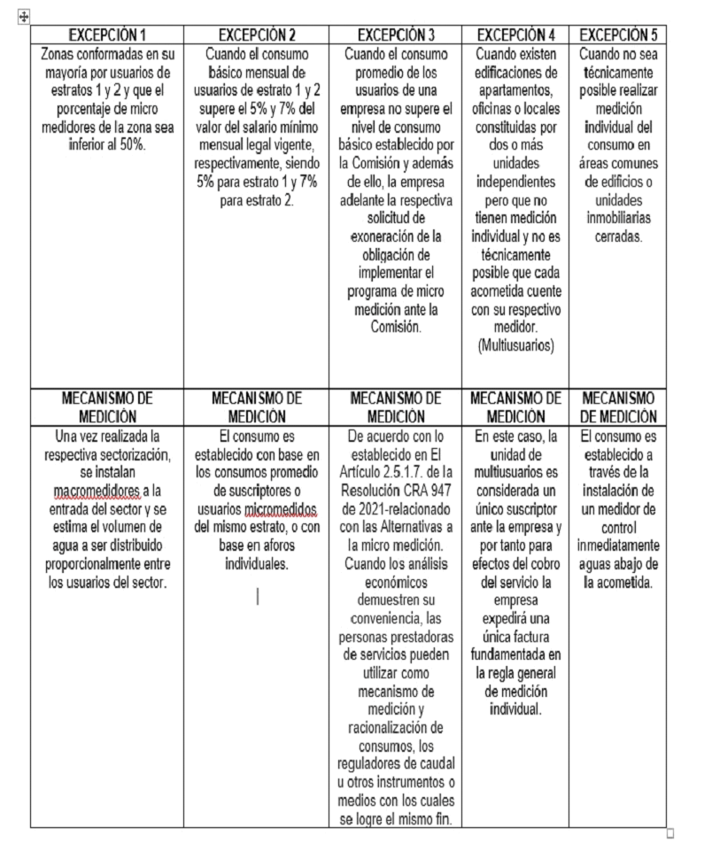 No obstante, existen excepciones al cumplimiento de la misma, cuando se presentan situaciones de tipo técnico, de seguridad o de interés social, que determinan la imposibilidad de instalar dispositivos de medida individuales, tal como se encuentra previsto en el Decreto Único Reglamentario 1077 de 2015 y en la Resolución CRA 943 de 2021, las cuales en resumen son las siguientes:
