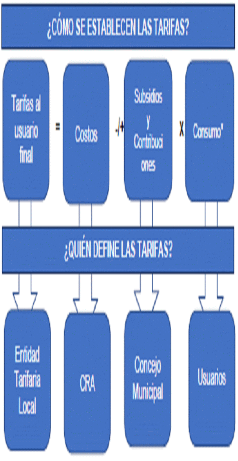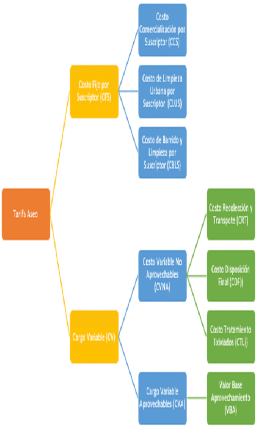 El cálculo de la tarifa de los servicios públicos de acueducto y alcantarillado incluye un Cargo Fijo (CF) y un Cargo por Consumo (CC). El cargo fijo se basa en los Costos Medios de Administración (CMA), mientras que el Cargo por Consumo (CC) por los siguientes: