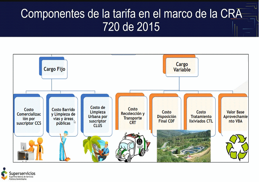 - El cobro de la tarifa implica un cargo fijo y un cargo variable considerando las diferentes actividades que conforman el servicio, según lo señalado en el artículo 2.3.2.2.2.1.13 del Decreto Único Reglamentario 1077 de 2015. Adicionalmente, según lo establecido en la Resolución CRA 943 de 2021, las metodologías tarifarias son distintas para quienes prestan el servicio en municipios de más de 5.000 suscriptores, que para aquellos que lo hacen en municipios de hasta 5.000 suscriptores.