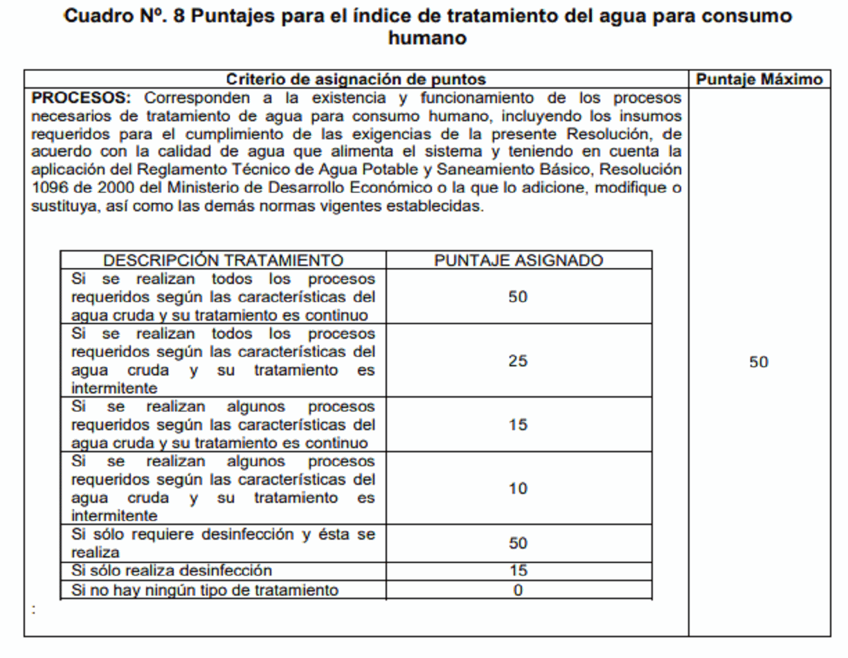 De acuerdo con lo indicado, para el índice de tratamiento, dentro de los criterios para la asignación de puntaje, se encuentran los procesos, que corresponden a la existencia y funcionamiento de aquellos necesarios para el tratamiento de agua para consumo humano, incluyendo los insumos requeridos para el cumplimiento de las exigencias de la Resolución 2115 de 2007, de acuerdo con la calidad de agua que alimenta el sistema, y teniendo en cuenta, además, la aplicación de la Resolución 330 de 2017 del Ministerio de Vivienda, Ciudad y Territorio, por medio de la cual se adoptó el Reglamento Técnico para el Sector de Agua Potable y Saneamiento Básico – RAS y sus disposiciones modificatorias.
