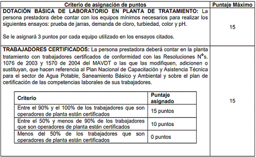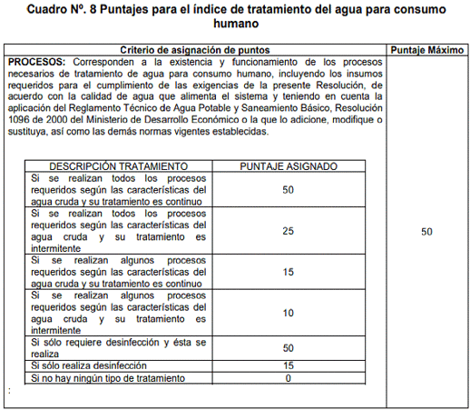 De acuerdo con lo indicado, para el índice de tratamiento, dentro de los criterios para la asignación de puntaje, se encuentran los procesos, que corresponden a la existencia y funcionamiento de aquellos necesarios para el tratamiento de agua para consumo humano, incluyendo los insumos requeridos para el cumplimiento de las exigencias de la Resolución 2115 de 2007, de acuerdo con la calidad de agua que alimenta el sistema, y teniendo en cuenta, además, la aplicación de la Resolución 799 de 2021 del Ministerio de Vivienda, Ciudad y Territorio, por medio de la cual se adoptó el Reglamento Técnico para el Sector de Agua Potable y Saneamiento Básico – RAS y sus disposiciones modificatorias."