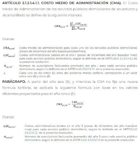 Con relación a lo expuesto y en el caso de prestadores que apliquen la Resolución CRA 688 de 2014, vale la pena considerar, a manera de ejemplo, lo indicado en el Título IV[10] de dicho acto administrativo, en el que se indica, respecto del costo medio de administración de los citados servicios, lo siguiente: