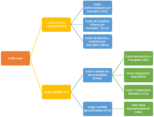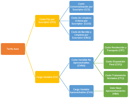 Ahora bien, el Capítulo I del Título II de la Resolución CRA 720 de 2015, indica que el precio máximo de la prestación del servicio está conformado por un Costo Fijo por Suscriptor (CFS) y un Costo Variable (CV) por tonelada de residuos no aprovechables y la remuneración por tonelada de residuos aprovechados, los cuales a su vez se encuentran conformados por los siguientes componentes:
