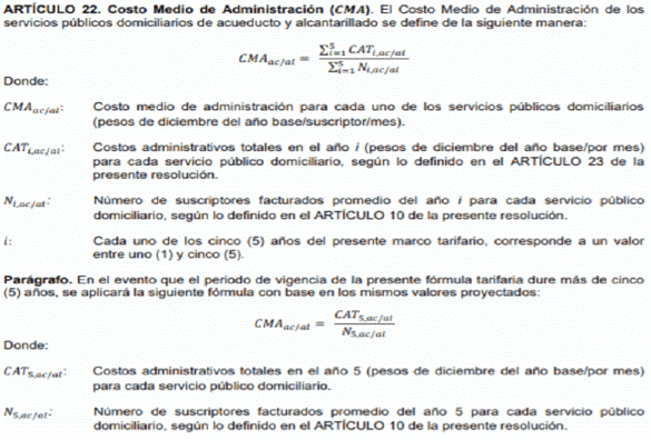 Como puede verse, si bien la fórmula que permite obtener el costo medio de administración de cada servicio es la misma, lo cierto es que cada uno de sus componentes refiere a los costos particulares de “cada uno de los servicios públicos domiciliarios”, de lo que se concluye que, si la ecuación a utilizar es igual, pero sus costos son distintos, los resultados en la aplicación de una y otra para cada servicio, serán diferentes.