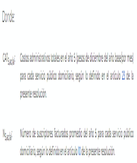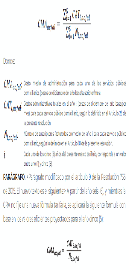 Como puede verse, si bien la fórmula que permite obtener el costo medio de administración de cada servicio es la misma, lo cierto es que cada uno de sus componentes refiere a los costos particulares de “cada uno de los servicios públicos domiciliarios”, de lo que se concluye que, si la ecuación a utilizar es igual, pero sus costos son distintos, los resultados en la aplicación de una y otra para cada servicio, serán diferentes.