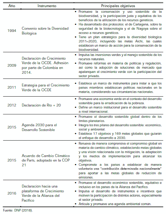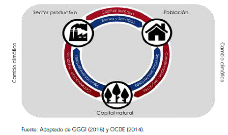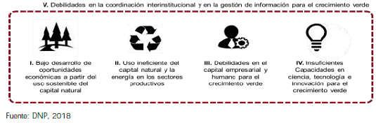 Colombia cuenta con un robusto marco político y normativo con el cual se busca reducir los impactos ambientales de las actividades productivas que soportan el desarrollo económico. El país ha realizado un esfuerzo para armonizar el desarrollo y el crecimiento de la economía con la protección de los recursos naturales, sin embargo, los sectores aún son intensivos en el uso de los recursos y han generado impactos en el capital natural, que inciden tanto en su oferta como en su calidad (DNP, Fedesarrollo, GGGI y PNUMA, 2017).