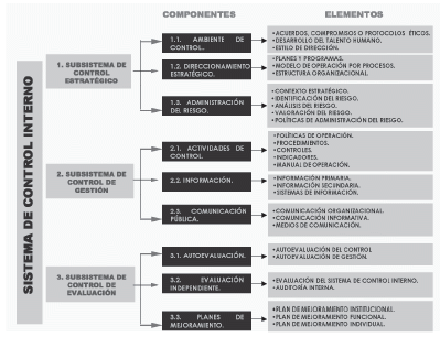 El Modelo Estándar de Control Interno para entidades del Estado, se genera tomando como base el artículo 1o de la Ley 87 de 1993, el cual se encuentra compuesto por una serie de subsistemas, componentes y elementos de Control, establecidos en la Figura 1, ilustrando de esta manera los vínculos existentes entre cada uno de ellos, bajo el enfoque sistémico que establece la citada ley.