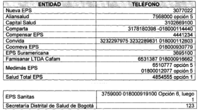 Así mismo, deberá informar a la EPS en las líneas de atención que esta disponga, para que inicie el protocolo estipulado por el Ministerio de Salud y Protección Social, entre las que se encuentran: