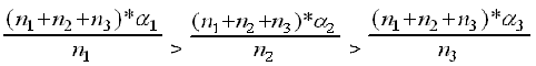 (n1+n2+n3)*alpha 1/n1 > (n1+n2+n3)*alpha 2/n2 > (n1+n2+n3)*alpha 3/n3