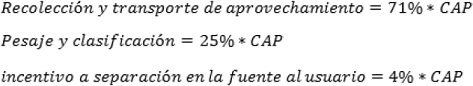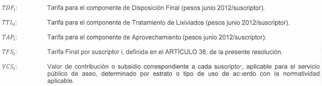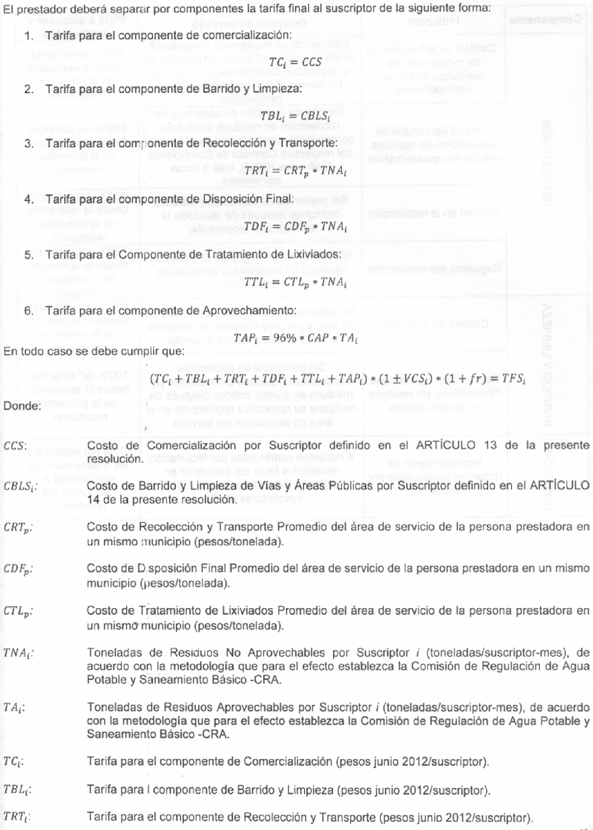 TARIFA PARA LOS COMPONENTES DEL SERVICIO PÚBLICO DE ASEO.