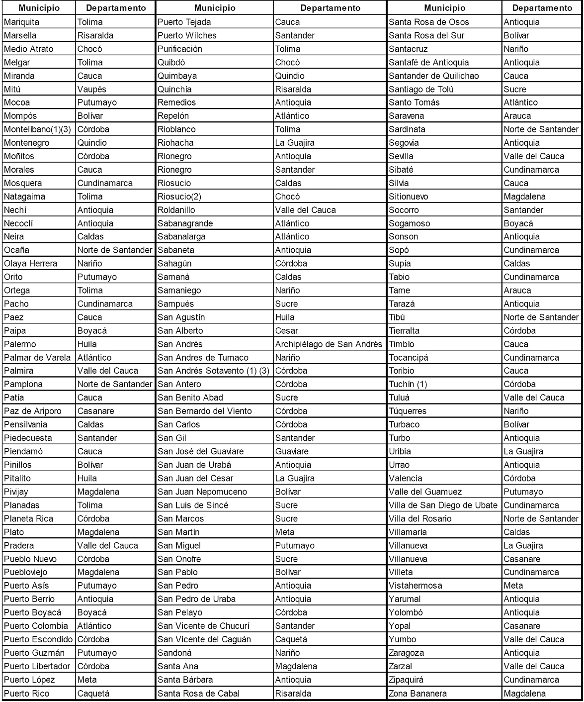MUNICIPIOS A LOS QUE APLICA LA PRESENTE RESOLUCIÓN POR SEGMENTOS.