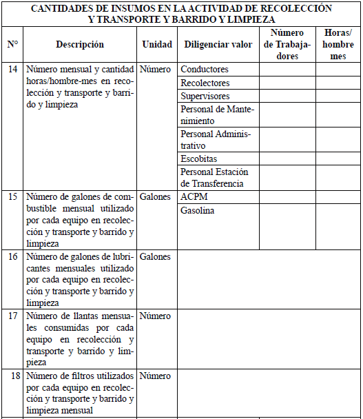 | Medición de las cantidades de insumos diferentes a trabajo que son utilizados para prestar los servicios de recolección y transporte, barrido y limpieza y disposición final. | Incluye: volquetas, camiones, motocicletas, compactadores, barredora mecánica, equipos menores, vehículos asignados a administración, vehículos para el transporte de operarios, tractocamiones, báscula de estación de transferencia, hidrolavadora de estación de transferencia y carrotanque estación de transferencia. |