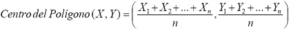 2. Calcular el centro del polígono irregular que forma el área de confluencia, para lo cual se deben determinar las coordenadas (x,y) de diferentes puntos que delimiten el polígono y reemplazarlos en la siguiente fórmula, la cual permitirá promediar y hallar las coordenadas de dicho centro.