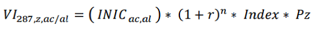 | VI287,z,ac/al: | Valor por cobrar de los activos o los proyectos z construidos con el plan de inversiones de la Resolución CRA número 287 de 2004 (VPIRER) para cada servicio público domiciliario, expresado en pesos de diciembre del año 2014. |