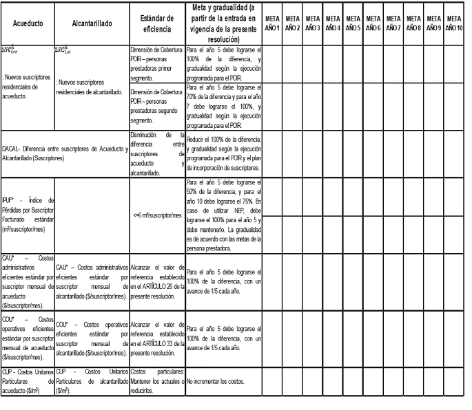 Las personas prestadoras deberán establecer metas anuales para reducir la diferencia entre el valor del año base y el estándar de eficiencia, con la gradualidad exigida en el artículo 9 de la Resolución CRA 688 de 2014, o la que la modifique, adicione o aclare y consignar tales metas en el contrato de servicios públicos domiciliarios.