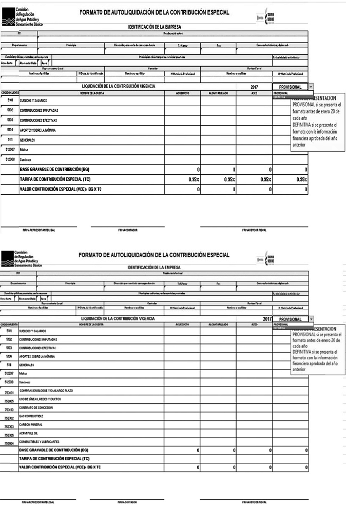 ARTÍCULO 3o. FORMATO DE AUTOLIQUIDACIÓN. Adóptase el “Formato de Autoliquidación de la Contribución Especial”, para la Comisión de Regulación de Agua Potable y Saneamiento Básico contenido en el anexo número 1.