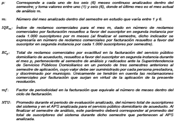 | Gestión Comercial | IQR | Reclamos comerciales para los servicios públicos domiciliarios de acueducto y alcantarillado. | Descuento en el cargo fijo. | Suscriptores que reclamaron y cuya reclamación fue resuelta a su favor en segunda instancia durante el semestre analizado. |
