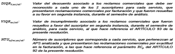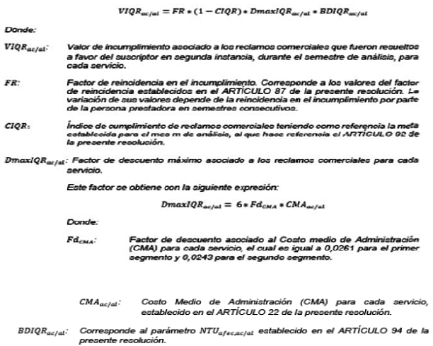 “Artículo 93. Valor de incumplimiento asociado a los reclamos comerciales (VIQRac/ al). El valor del incumplimiento de la persona prestadora respecto del indicador CIQR para los servicios públicos domiciliarios de acueducto y alcantarillado se determina semestralmente, mediante la siguiente expresión: