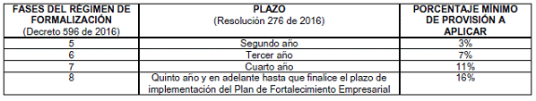 ARTÍCULO 167. PORCENTAJE DE PROVISIÓN DE INVERSIONES PARA LAS ORGANIZACIONES DE RECICLADORES DE OFICIO EN PROCESO DE FORMALIZACIÓN. Las organizaciones de recicladores de oficio que estén en proceso de formalización como personas prestadoras de la actividad de aprovechamiento, y atiendan usuarios en área urbana de municipios de hasta 5.000 suscriptores, deberán provisionar de forma progresiva los recursos de inversión provenientes del recaudo asociado a la remuneración de esta actividad, iniciando con el tres por ciento (3%) hasta completar el diez y seis por ciento (16%), para apoyar la financiación de los Planes de Fortalecimiento Empresarial. En la tabla se presenta el porcentaje de provisión que deberá aplicarse a partir del primer mes de cada fase:
